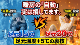 「自動」にして足元が寒いからといって、設定温度を25℃から27℃に上げたり、別の電気ヒーターを併用したりするのが、一番電気代が高くつく行為なのです。
